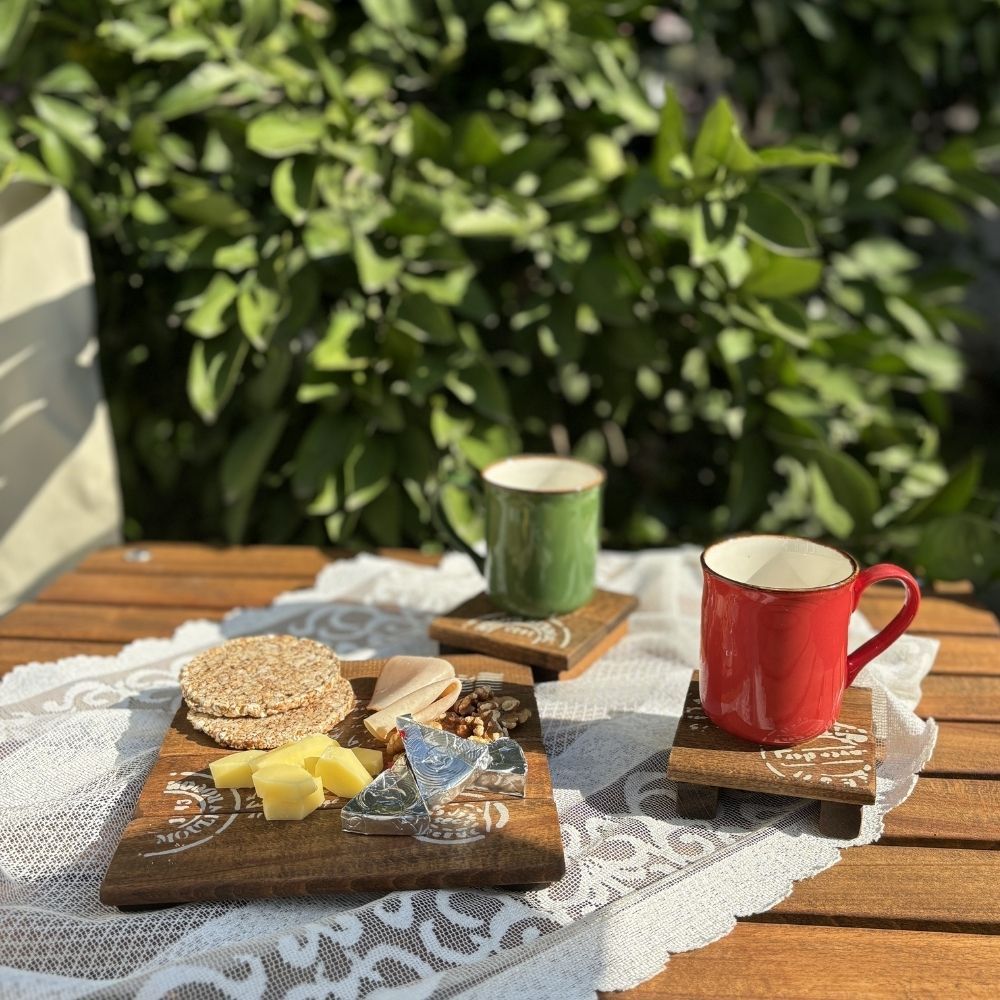 Bag The Joy olarak yalnızca kamp masalarında değil, küçük ölçekli ahşap parçalarda da atık yaratmamak için özel ürünler geliştiriyoruz. Atölyemizde üretim sonrasında kalan masif ahşap parçalar, kadınların marifetli ellerinde özenle tasarlanıyor, bardak altlığı ve sunum tablalarına dönüştürülüyor.