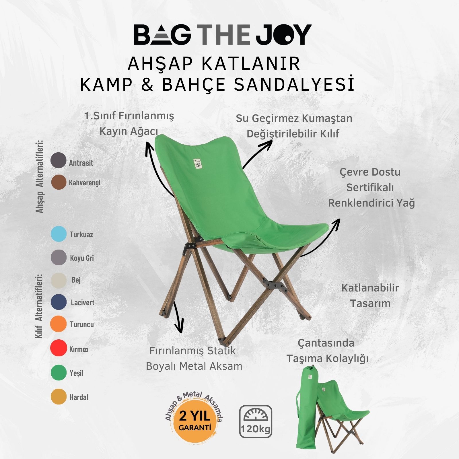 Açık hava keyfini dilediğiniz her yere taşımanızı sağlayan BAG THE JOY Ahşap Kamp ve Bahçe Sandalyesi, doğa tatilleri, bahçe – teras keyfi ve sevdiklerinizle yapacağınız açık hava pikniklerinizin vazgeçilmezi olacak.
