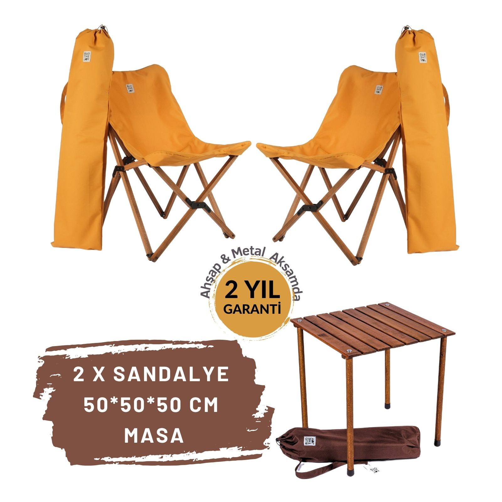Bag The Joy Ahşap Katlanır Kamp Masa Sandalye Seti 50x50x50 cm | Çantalı | Kahverengi – Hardal